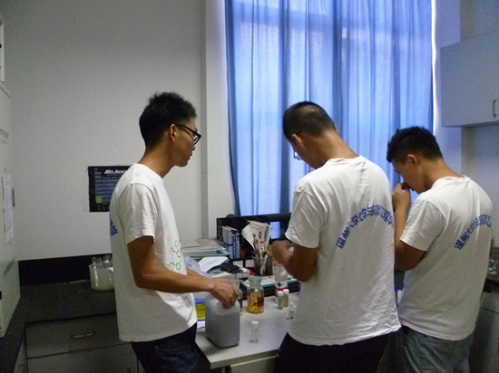 酷暑炎炎,今天下午是我们实践队内部联谊,为了日后更好的合作,大家一块儿聚在一起吃了顿饭。吃完饭后诺亚绿舟暑期社会实践队的调研小组成员就开始工作了。调研组长已将数据整理完毕。每一种水样都有八个数据,即取样时的温度、时间、地点,水样中COD、氨氮含量、铬离子含量、磷酸盐含量以及溶解氧的含量。在前几天已去六种水样,也说明我们有六组数据需要绘制成图表。不得不说,上学期的WINDOS7的学习为我们带来了很多便利。小组成员将数据输去电脑,利用EXCLE绘制成我们需要的图表。把数据转换为图表的工作算是完成了,组长又对后期的调研进行任务的分配,有了前期的经验,相信后期将会做得更好。