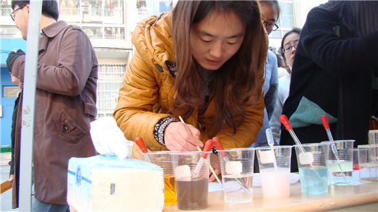 下午4点,天上的夕阳散发着迷人的光芒,地上的人儿依旧沉醉在化学的魅力中。此次“化学游园会”活动由化材学院团委学生会科竞中心及志愿者们团结合作,将“化学”进行到底,让更多的同学更加了解化学的乐趣和神奇,展现了我们化材学院的专业特色。
