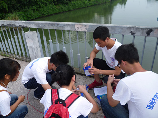 2014年7月4日上午,温州大学化学与材料工程学院诺亚绿舟暑期社会实践队全体队员前往鹿城区锦江河和划龙桥河段取水样。
