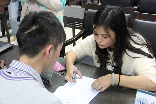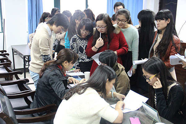 2014年11月12日,化学与材料工程学院就业服务活动之简历会诊在化材楼11-B208举行。会诊团队由陈爱、林萍、姜海燕、王壮四位老师组成,参诊人员为化材学院毕业班本科生和研究生。