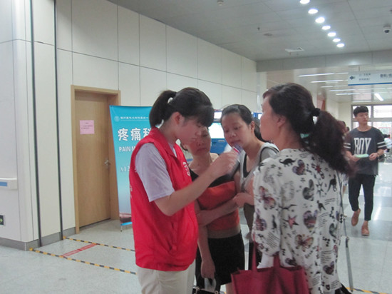 2014年7月3日8:30,温州大学化学与材料工程学院“微笑天使”暑期社会实践队第四天在温州医科大学附属第一医院进行了以志愿者形式展开的实践活动,期间全体20名成员身着红色志愿者马甲热情地为熙熙攘攘的人群服务。