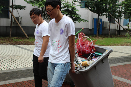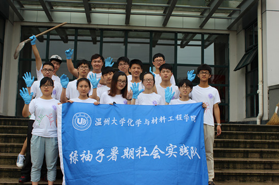 2014年7月3日上午,温州大学化学与材料工程学院“绿袖子”暑期实践队的成员帮助学院的管理员清理垃圾,清理草坪。