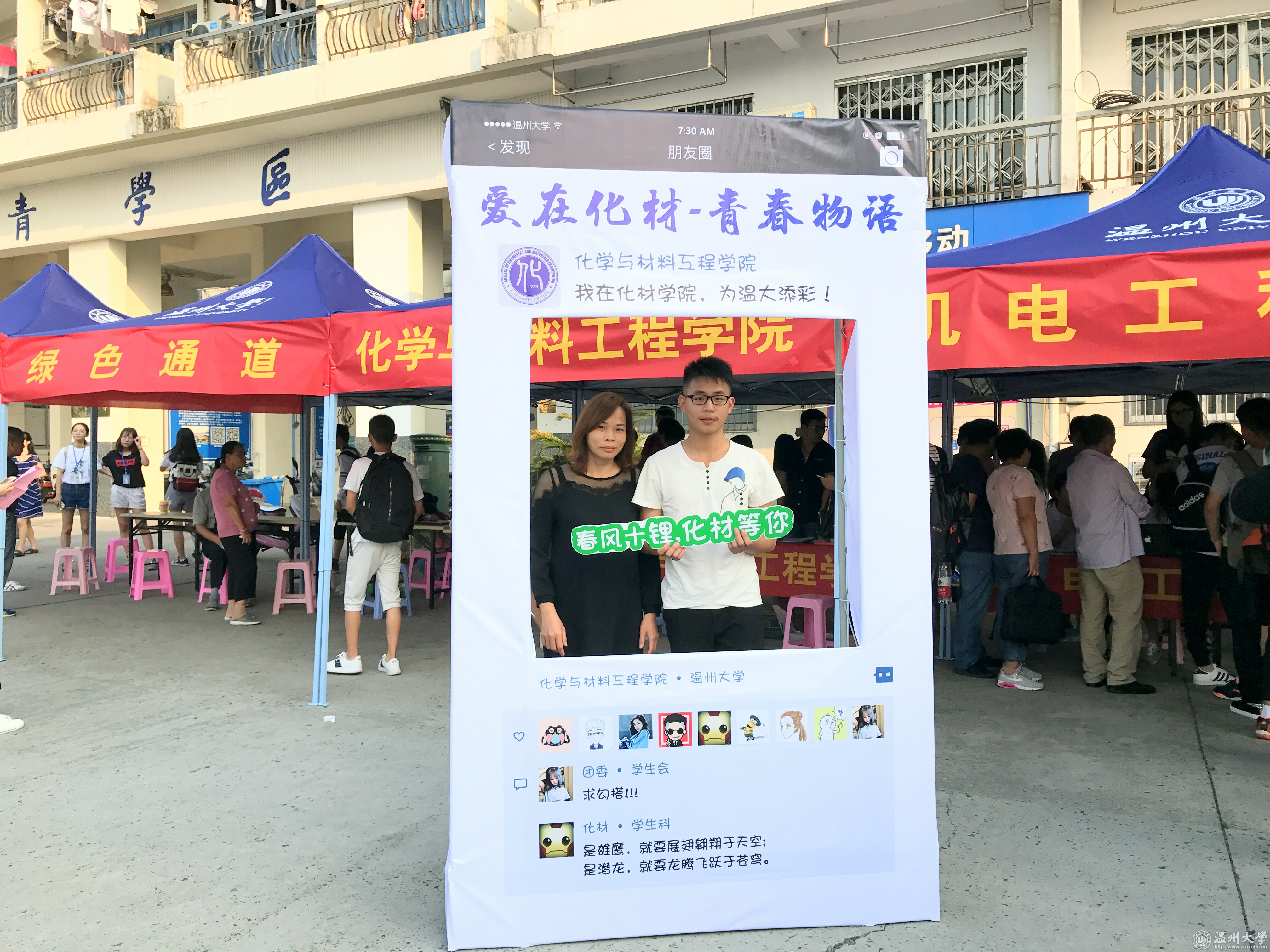 来自17化本班的林同学说:“报到第一天,我真的被学院创意的合影框惊到了,‘春风十锂,化材等你’‘氢春有你’‘钠么美好’等带有化学元素的祝福语洋溢着青春活力又充满了浓浓的化学情。新加入的“化材新元素”们深切感受到来自化材学院的用心,纷纷与自己父母在相框合影留念,纪念这一美好时刻,大学不是终点,是一个新的起点;他们带着父母的期许,自我的追求踏上新的征程。