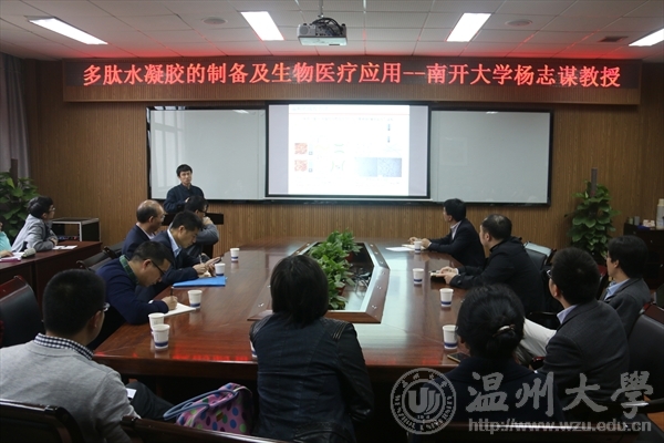 4月18日上午,南开大学生命科学学院杨志谋教授来我院作了题为《多肽水凝胶的制备及生物医疗应用》的学术报告。校长李校堃、化材学院书记方乐平、副院长杨小平、副院长陈久喜、相关师生50余人参加了此次学术报告。