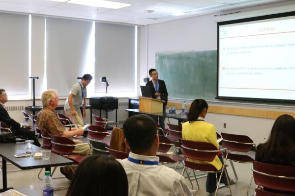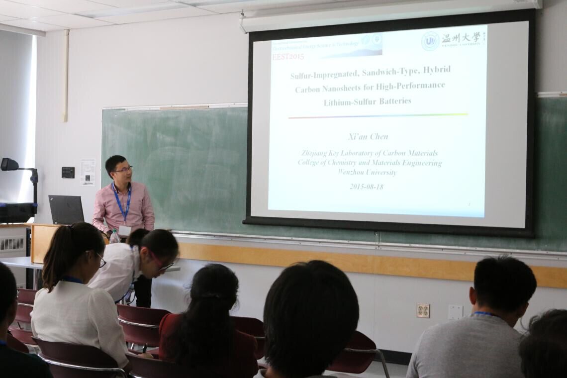 8月16日至22日,化学与材料工程学院王舜教授带领5位青年教师应邀参加了在加拿大哥伦比亚大学举行的第二届国际电化学能源科学与技术会议,并做了题为“Novel-structured Nanomaterials for Fuel Cell”的邀请报告。会议期间,学院邹超博士、杨克勤博士、林大杰博士、陈锡安博士以及金辉乐高级实验师也分别就自身在太阳能电池、燃料电池、锂硫电池等领域所取得最新研究结果在分会场上做专题报告。此次会议交流,不仅提升了温州大学在海内外的知名度,而且极大地促进了我院同国际电化学领域著名专家学者的合作与交流。学术交流活动得到了浙江省重中之重化学一级学科和国家自然科学基金项目经费的支持。