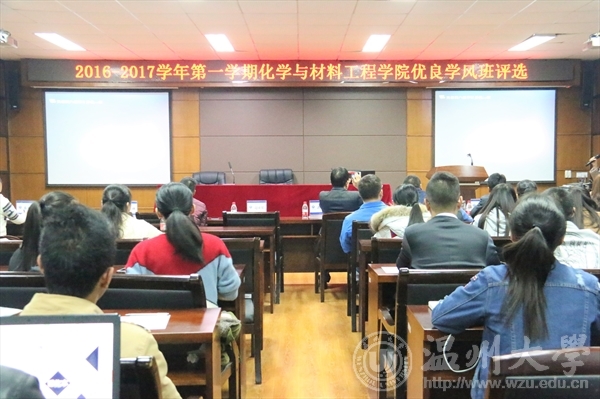 12月5日晚,化学与材料工程学院在11B208室举行了2016-2017学年第一学期“院优良学风班”现场评比活动。学院党总支副书记潘从义、化工系主任徐进老师、化学系副主任徐清老师、应化系主任赵亚娟老师、材料系副主任刘若望老师、学生科科长王壮老师、蔡玲飞老师以及杨程程老师等共8位老师出席活动并担任评委, 40余名班级学生代表担任大众评委。