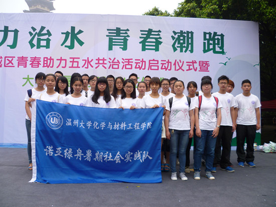 2014年7月1日,温州大学化学与材料工程学院“诺亚绿舟”暑期实践队全体成员参加了由温州市共青团鹿城区委员会主办的以“助力治水,青春潮跑”为主题的五水共治活动启动仪式暨大学生暑期社会实践出征仪式及五水共治快闪活动。
