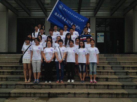 2014年6月28日14:00分诺亚绿舟暑期社会实践队队员在化材楼11C-401参加了化学与材料工程学院2014年暑期社会实践出征仪式。首先由孙安梭老师进行安全知识的教育,再由林萍老师介绍了今年化材学院的8支实践队,其中包括4支重点团队和4支一般团队。然后学生志愿代表进行讲话。最后孙安梭老师为8支实践队授旗,全体实践队员及指导老师在一楼大厅拍摄集体照留念。