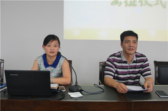 紧接着由13化本暑期社会实践代表代表所有的同学出征宣言。会议最后,孙安梭老师为各暑期社会实践队授旗,合影留念。