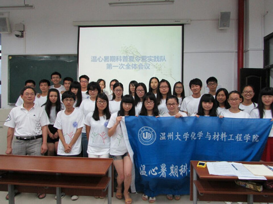 2014年6月28日下午2点,温州大学化学与材料工程学院”温心暑期科普夏令营”社会实践队参加了在11C-401教室举行的出征仪式。并在6月28日晚上6点,展开了温心暑期科普夏令营社会实践队第一次全体会议。