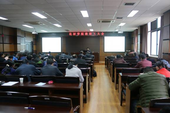 2016年1月12日下午,化学与材料工程学院在11B-208会议室召开了教职工大会。会议由党总支书记方乐平主持,学院全体教职工参加。