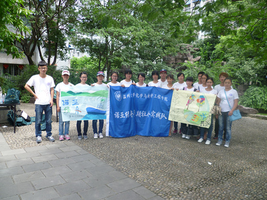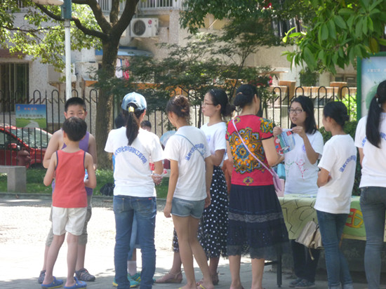 2014年7月8日,温州大学化学与材料工程学院“诺亚绿舟”暑期社会实践队的队员们来到了温州市南浦街道清风社区向温州市民们普及五水共治知识。