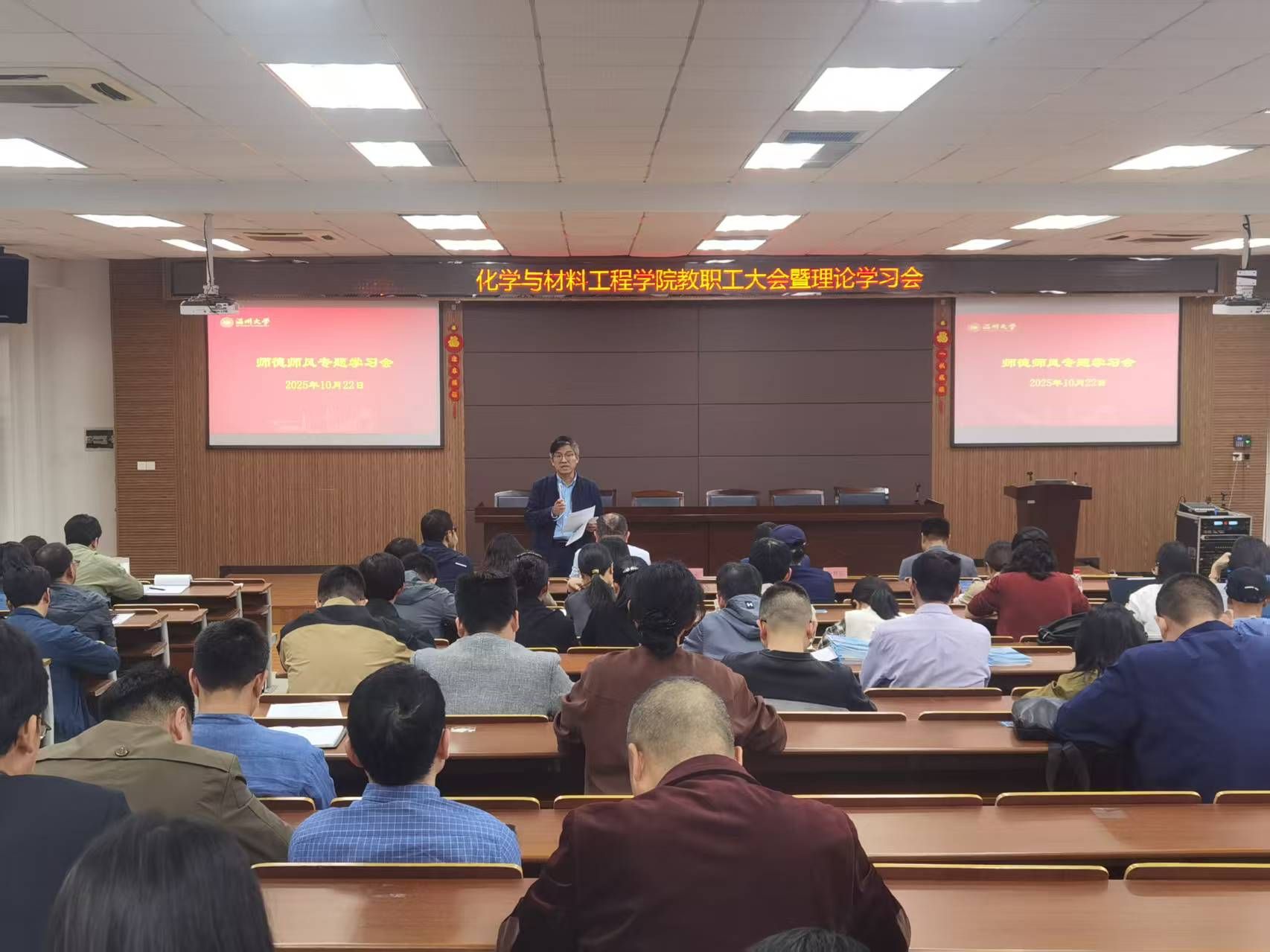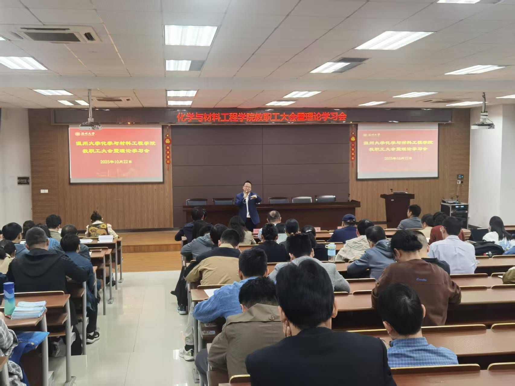10月23日下午,温州大学化学与材料工程学院在11C401会议室召开教职工大会暨理论学习会。学院全体教职工参加会议。