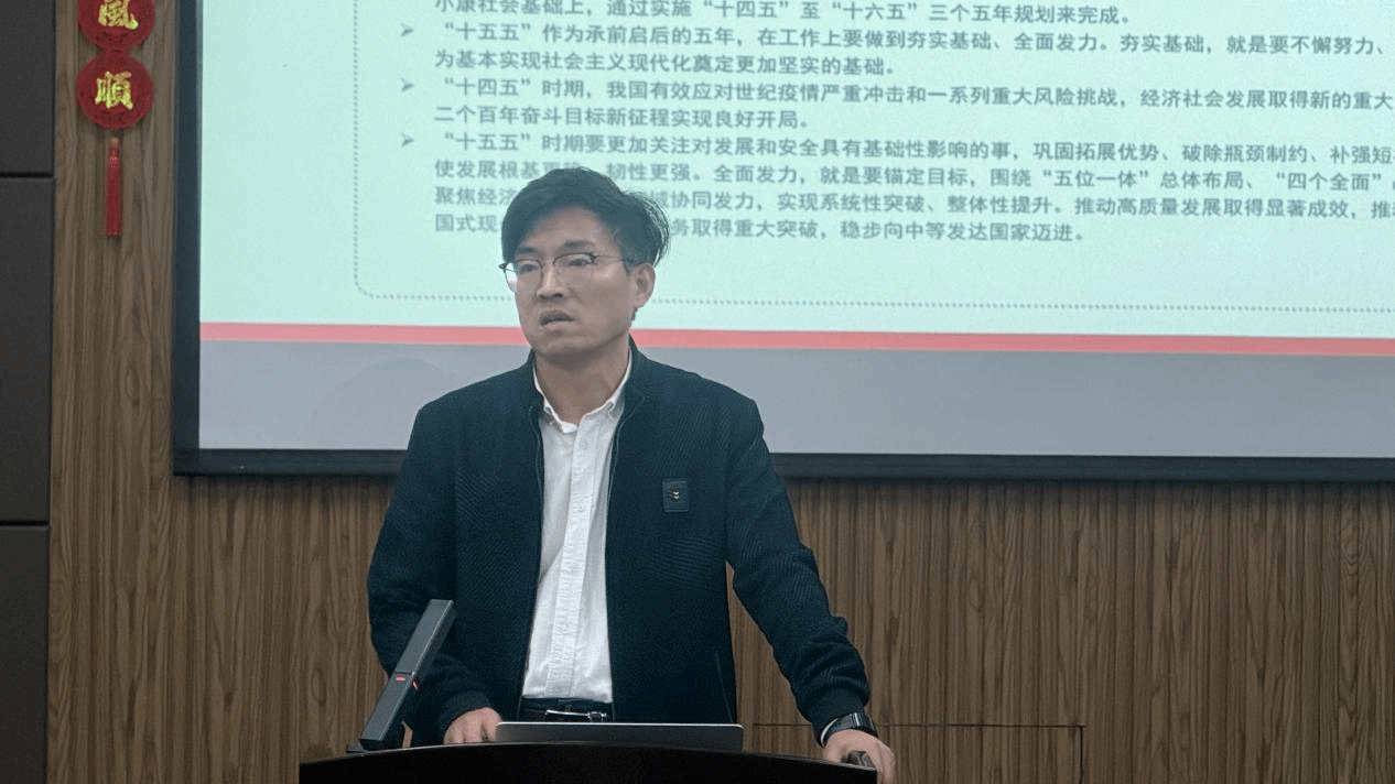 会议第一项议程中,学院党委书记邹超围绕党的二十届四中全会精神作专题领学报告。他以“十五五”时期经济社会发展指导方针为核心主线,从历史方位、丰富内涵、实践要求三个维度,对全会精神进行全面系统的解读阐释。邹超指出,“十五五”时期是我国基本实现社会主义现代化的关键承启阶段,既需立足中国式现代化历史进程夯实发展根基,更要主动应对世界百年未有之大变局带来的机遇与挑战,以识变之智、应变之方、求变之勇开创发展新局。