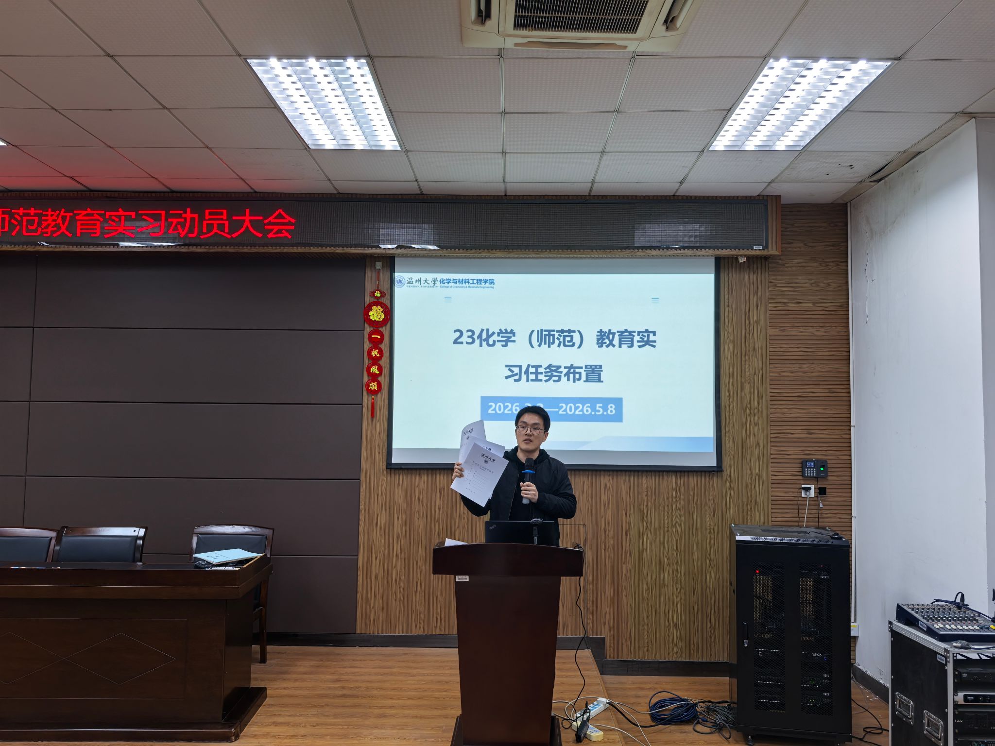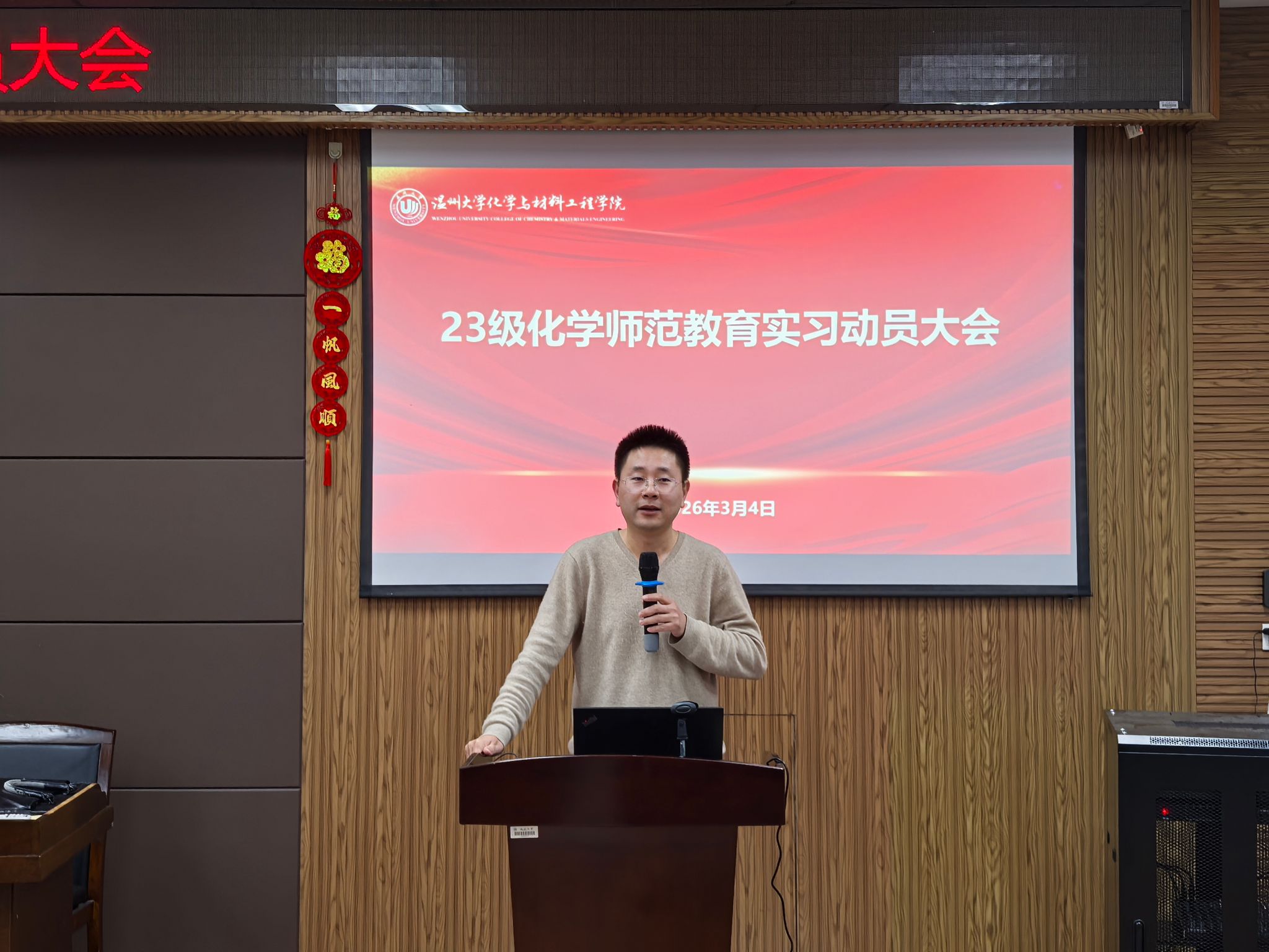 为扎实推进师范生教育实践工作,提升学生职业素养与育人能力,化材学院于2026年3月4日召开2023级教育实习动员暨安全教育大会。会议由学工办主任邹涌彬主持,副院长袁一斐以及叶剑强等指导老师出席。