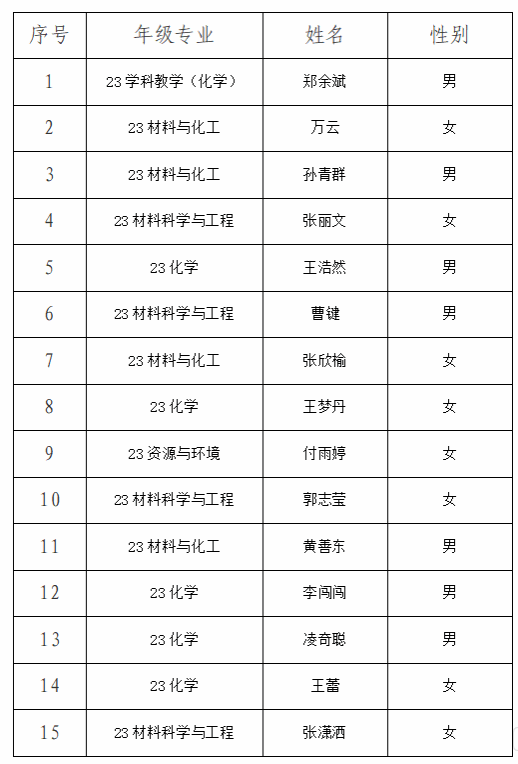 根据省教育厅、财政厅有关文件精神及《温州大学研究生国家奖学金管理办法》,《温州大学化学与材料工程学院研究生国家奖学金评比细则》等文件精神,由学生自愿申请并提交相关材料,经学院初审,研究生奖助学金评审委员会进行公开答辩评审等程序,确定拟推荐候选人名单。现将评审结果予以公示,公示时间从2025年10月10日至2025年10月15日。