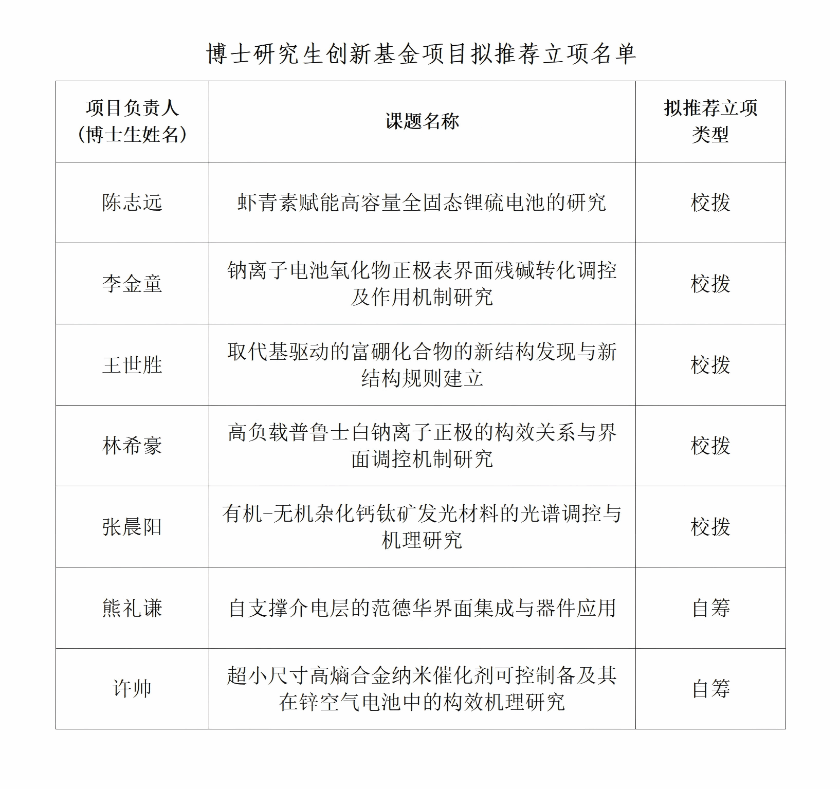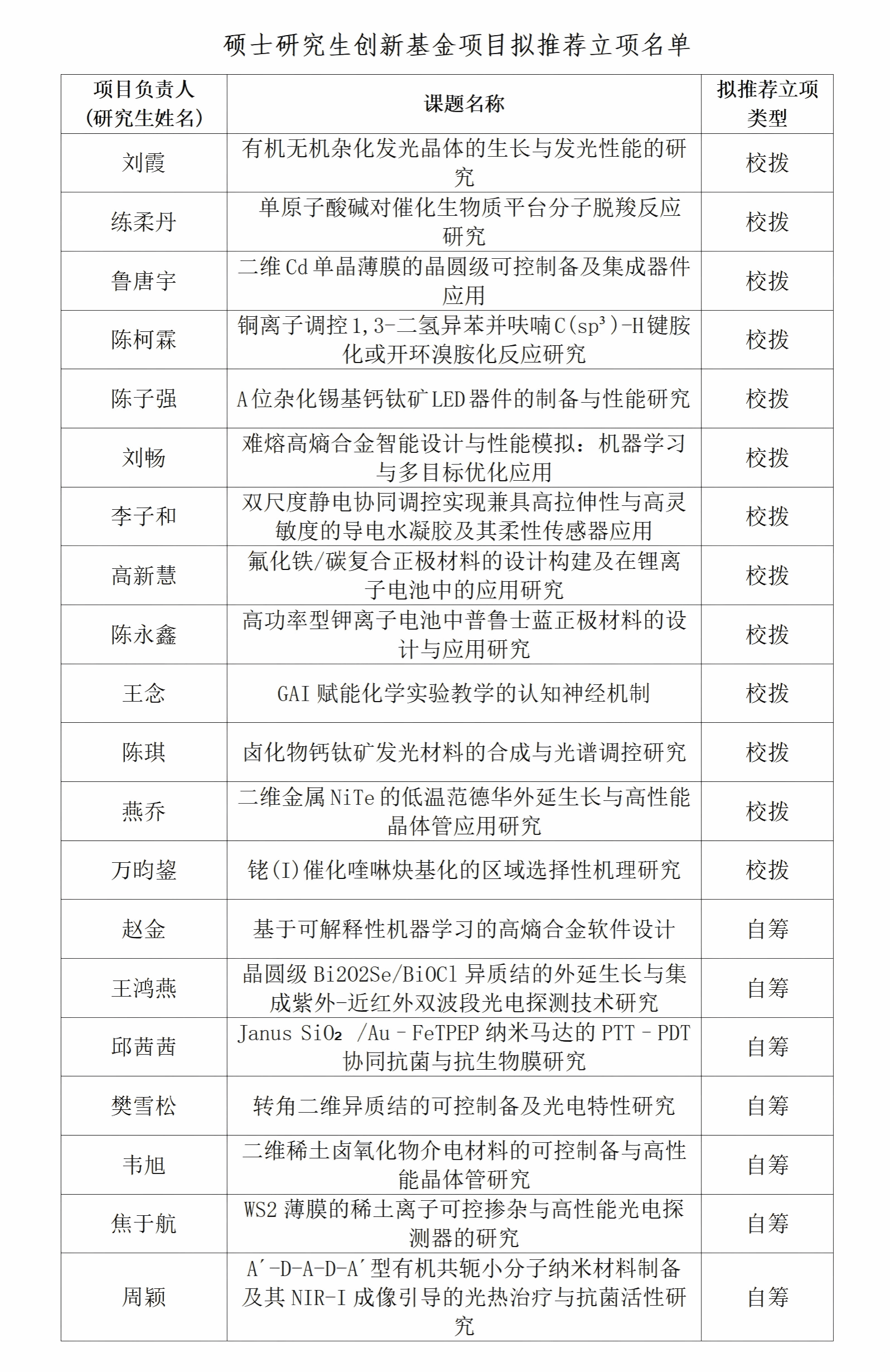 根据《温州大学硕士研究生创新基金管理办法(2024年修订)》(附件1)、《温州大学博士研究生创新基金管理办法(2024年修订)》(附件2)的相关规定,按照学校分配的名额比例,由学生个人申请并提交相关材料,经学院初审,评审委员会进行评审等程序,现将温州大学化学与材料工程学院2025年度研究生创新基金项目拟推荐立项结果予以公示。