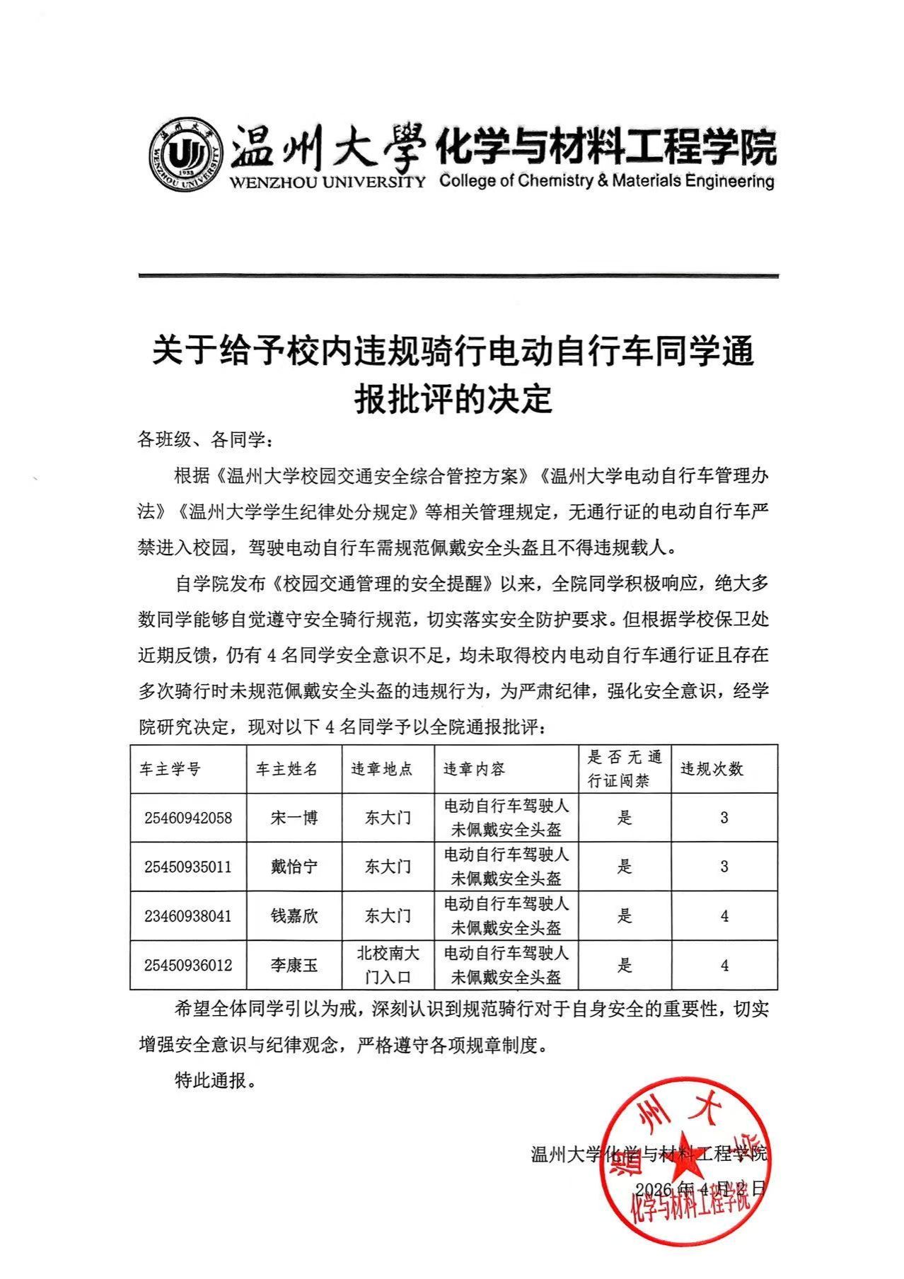 关于给予校内违规骑行电动自行车同学通报批评的决定(二)
