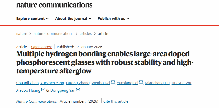 该论文以“Multiple hydrogen bonding enables large-area doped phosphorescent glasses with robust stability and high-temperature afterglow”为题发表于国际顶级期刊⟪Nat. Commun.⟫。我校化材学院23级博士生陈川力第一作者,我校化材学院雷云祥、黄小波、戴文博以及北京师范大学闫东鹏教授为通讯作者,相关工作得到了国家自然科学基金的支持。据悉这是该研究团队以温州大学为第一通讯单位在⟪Nat. Commun.⟫期刊上发表第四篇研究性论文,体现出该团队在有机发光材料研究领域的研究深度。