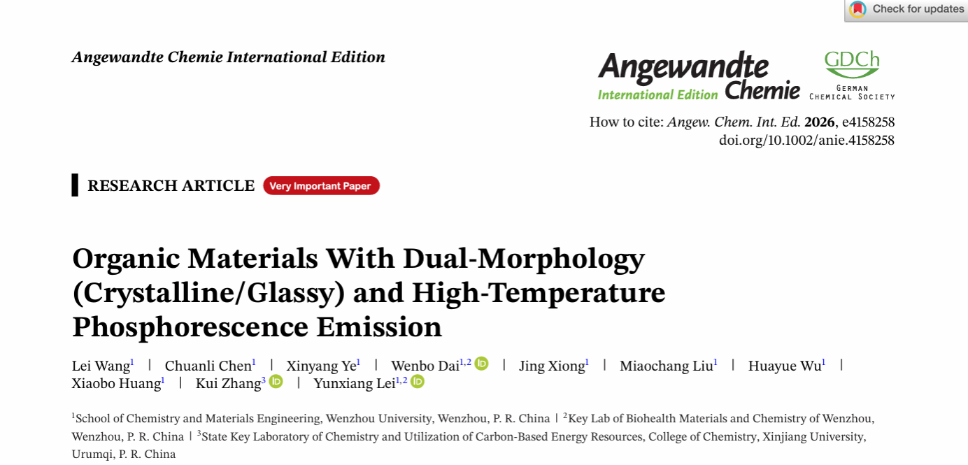 该论文以“Organic Materials with Dual-morphology (Crystalline/Glassy) and High-temperature Phosphorescence Emission”为题发表于国际顶级期刊《Angew. Chem. Int. Ed》,并被评选为VIP文章。我校化材学院硕士生王蕾、博士生陈川力为共同第一作者,雷云祥、黄小波、戴文博以及新疆大学张奎教授为共同通讯作者,相关工作得到了国家自然科学基金的支持。